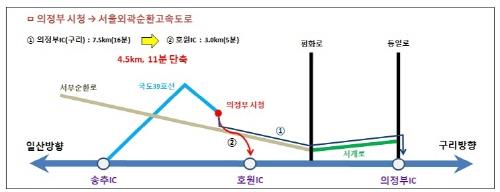 그동안 의정부시청에서 서울외곽순환고속도로를 타려면 7.5㎞, 16분이 걸렸지만 호원나들목을 이용하면 3㎞, 5분만 이동하면 돼 11분 정도를 단축할 것으로 예상된다.