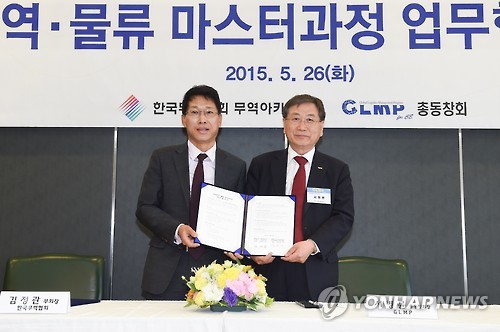 | △ '전자무역·물류 마스터과정' 업무협약 체결식 (서울=연합뉴스) 김정관 무역협회 상근부회장(왼쪽)과 서병륜 글로벌 물류 최고경영자과정(GLMP) 총동창회장이 26일 서울 삼성동 트레이드타워에서 '전자무역·물류 마스터과정' 업무협약을 체결하고 있다. (무협 제공) |