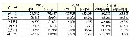수도권 외 지방은 대구(132가구)·세종(1천2가구)·충북(1천154가구) 등에서 실적이 감소하면서 작년 4월보다 2.9% 감소했다.