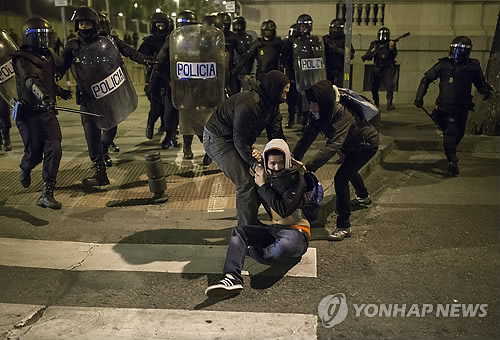 | △ 스페인 시민 수만명이 22일(현지시간) 수도 마드리드 중심부에 모여 정부의 긴축정책에 반발하는 대규모 시위를 벌였다. 시민들은 긴축정책으로 실업자가 양산되고 있다고 규탄하며 집권 국민당(PP) 당사로 향하다 진압에 나선 경찰과 격렬하게 충돌했다. (AP=연합뉴스) |