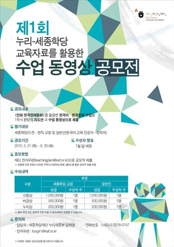 '제1회 누리-세종학당 교육자료를 활용한 수업 동영상 공모전'에 응모하기를 희망하는 사람은 재단의 온라인 학습 사이트 '누리-세종학당'(www.sejonghakdang.org)에 게재된 '만화 한국 전래동화' 자료를 활용, 동영상으로 제작해 출품하면 된다.