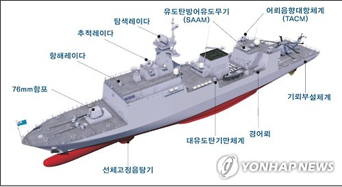 | △ 3천t급 차기 기뢰부설함 '남포함' 진수 (서울=연합뉴스) 27일 울산 현대중공업에서 진수식을 하는 해군의 차기 기뢰부설함인 '남포함'의 형상 및 제원 이미지. 3천t급인 남포함은, 승조원 120명, 길이 114m, 전폭 17m, 높이 28m, 최대속력 23노트로 전시에 주요 항만과 핵심 해역 방호를 위한 보호기뢰 부설과 기뢰전 전대의 기함 임무를 수행하게 된다. 2015.5.27 << 해군 제공 >> photo@yna.co.kr |