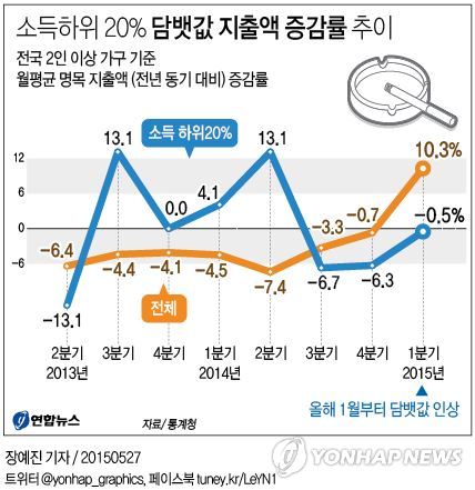 (서울=연합뉴스) 김인철 기자 = 올해 1월 담뱃세 인상으로 담배가격이 80%가량 오른 뒤 소득수준 하위 20% 이내 계층에서만 담배를 사는 데 쓰는 지출이 감소한 것으로 나타나자 27일 온라인에서는 "이참에 금연을 하라"는 의견과 "서민만 부담을 주는 정책"이라는 입장이 충돌했다.
