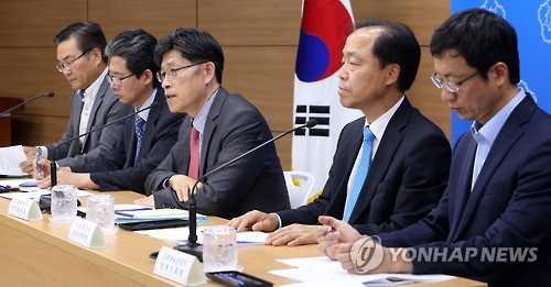| △ 공공기관 3대분야 기능조정 사전 브리핑 (세종=연합뉴스) 배재만 기자 = 노형욱 기획재정부 재정관리관(가운데)을 비롯한 관계부처 정책관들이 26일 오후 정부세종청사 기획재정부 공용브리핑룸에서 공공기관 3대분야(SOC, 농림-수산, 문화-예술) 87개 기관 중 52개 기관의 업무를 조정하고 이 중 4개 기관을 폐지하는 내용의 공공기관 정상화 추진방향에 대해 사전 브리핑하고 있다. 왼쪽부터 임정빈 농식품부 정책기획관, 권대철 국토교통부 토지정책관, 노형욱 기획재정부 재정관리관, 조봉환 기획재정부 공공정책국장, 김현환 문화체육관광부 정책기획관. 2015.5.27 scoop@yna.co.kr http://blog.yonhapnews.co.kr/f6464 |