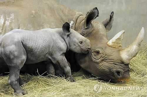| △ 미국 사우스다코다 주의 수폴스(Sioux Falls) 동물원에서 2010년 10월 촬영된 코뿔소 어미와 새끼의 모습. 2015.5.28.<<연합뉴스DB>> |
