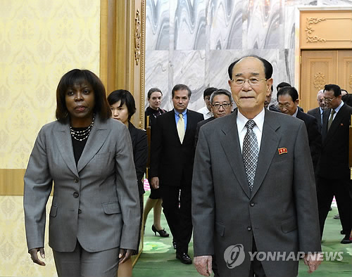 | △ 유엔 세계식량계획 사무총장 일행 접견한 김영남 위원장 (평양 조선중앙통신=연합뉴스) 김영남 북한 최고인민회의 상임위원장이 20일 평양 만수대의사당에서 어써린 커즌 유엔 세계식량계획(WFP) 사무총장 일행을 접견했다고 조선중앙통신이 이날 보도했다. 2014.5.20 photo@yna.co.kr |