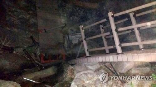 | △ 화천서 훈련 중 나무다리 끊어져 장병 21명 부상 (화천=연합뉴스) 이재현 기자 = 28일 오전 1시 30분께 강원 화천군 사내면 용담리 인근 생태탐방로 둘레길에서 육군 모 부대 소속 장병 21명이 야간 전술 훈련 중에 나무다리가 끊어지면서 3m 아래로 추락, 장병 21명이 다쳤다. 사진은 나무다리가 끊어진 현장 모습. |