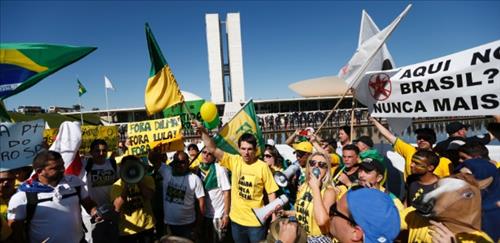 | △ 자유브라질운동(MBL) 회원들이 브라질리아 연방의회 앞에 모여 지우마 호세프 대통령 탄핵을 촉구했다.(출처:브라질 뉴스포털 UOL) |