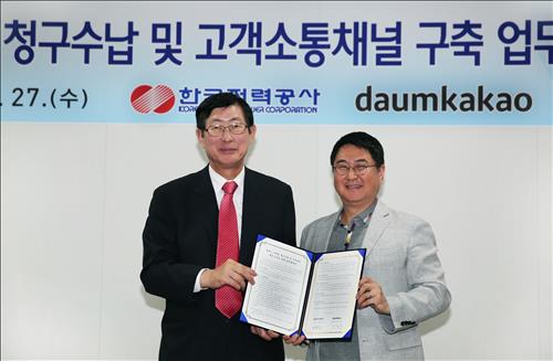 (서울=연합뉴스) 이봉준 기자 = 한국전력[015760]은 27일 나주 본사에서 다음카카오[035720]와 '핀테크를 적용한 전기요금 청구 및 납부, 양방향 소통채널 구축을 위한 업무협약'을 맺었다고 28일 밝혔다.