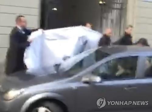 | △ 체포된 FIFA 간부들이 호텔 옆문으로 빠져나가는 동안 호텔 직원들이 침대 시트로 가려주고 있는 장면을 촬영한 휴대전화 동영상 캡쳐했다. (AP=연합뉴스) |
