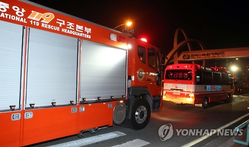 | △ (부산=연합뉴스) 조정호 기자 = 28일 오후 부산시 기장군 장안읍에 있는 고리원전 1발전소 터빈건물 3층에서 연기가 발생하면서 화재경보가 울렸다. 소방차량이 긴급 출동, 고리원전 정문을 통과하고 있다. 2015.5.28 ccho@yna.co.kr |