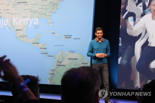 | △ 구글 I/O 개막 기조연설하는 순다르 피차이 (샌프란시스코=연합뉴스) 임화섭 특파원 = 세계 최대의 인터넷 서비스 기업 구글의 순다르 피차이 선임부사장이 28일(현지시간) 샌프란시스코 모스코니 센터 서관에서 개발자 회의 '구글 I/O 2015'의 기조연설을 하고 있다. 2015.5.29. solatido@yna.co.kr |
