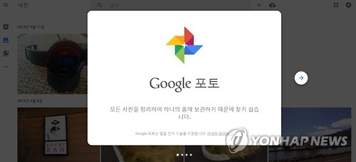 | △ '구글 포토' 출시 (샌프란시스코=연합뉴스) 임화섭 특파원 = 고해상도 사진을 무료로 무제한 자동으로 저장할 수 있는 클라우드 서비스 '구글 포토'가 출시된 28일(현지시간) 이 서비스의 초기화면. 2015.5.29. solatido@yna.co.kr |