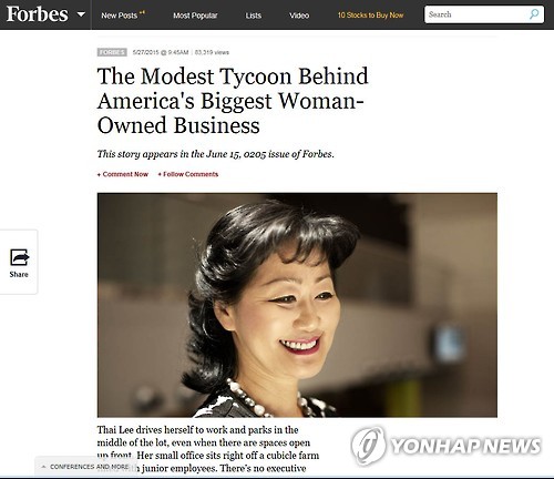 (뉴욕=연합뉴스) 박성제 특파원 = 한국 출신인 타이 리(56)가 미국 최대 여성소유 기업을 경영하고 있다고 포브스가 28일(현지시간) 보도했다.