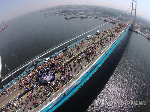 | △ 울산대교 시민개방 행사 (울산=연합뉴스) 이상현 기자 = 26일 울산대교에서 시민개방 행사가 열리고 있다. 울산대교는 29일 준공하고 6월 1일 개통된다. 개통 후 10일간 통행료는 전 구간 무료다. 2015.5.26 <<울산시>> leeyoo@yna.co.kr |