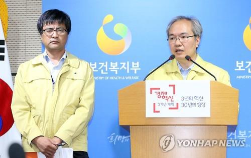 | △ (세종=연합뉴스) 배재만 기자 = 권준욱 보건복지부 공공보건정책관이 29일 오전 정부세종청사 보건복지부 공용브리핑룸에서 메르스 일일상황점검회의 결과를 브리핑하며 금일 오전 7시 현재 2명의 신규 환자를 확인했다고 밝히고 있다. 현재까지 총 환자 수는 9명이다. 왼쪽은 김영택 질병관리본부 감염병관리과장. 2015.5.29 scoop@yna.co.kr http://blog.yonhapnews.co.kr/f6464 |