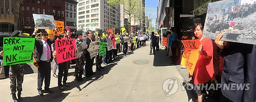 | △ 북한 유엔대표부 앞에서 시위하는 탈북자들 (뉴욕=연합뉴스) 박성제 특파원 = 탈북자들이 30일(현지시간) 미국 뉴욕의 북한 유엔대표부 앞에서 북한 인권 유린에 항의하는 시위를 하고 있다. 이들은 이날 유엔본부에서 미국 유엔대표부와 한국 유엔대표부가 공동 주최한 탈북자 증언 행사를 끝낸 뒤 북한 유엔대표부 앞에서 'D.P.R.K out of U.N' 등의 피켓을 들고 구호를 외치며 북한 인권 개선을 촉구했다. 2015.5.1 << 북한자유연합 제공 >> photo@yna.co.kr |