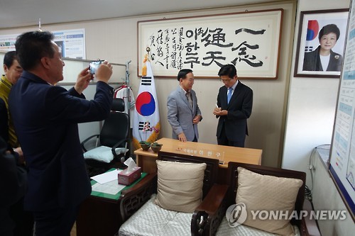 | △ "제 자리가 될까요?" (대구=연합뉴스) 김선형 기자 = 29일 김문수 전 경기도지사가 대구 수성갑 새누리당 당원협의회 사무실에서 당원들을 만나고 있다. 2015.5.29 sunhyung@yna.co.kr |
