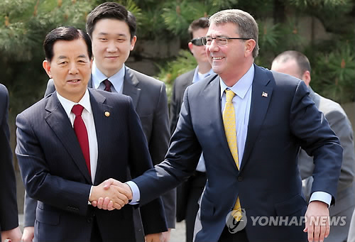 | △ 한민구 국방부 장관과 애슈턴 카터 미 국방장관 (연합뉴스 자료사진) |