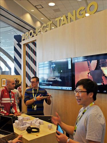 (서울=연합뉴스) 현윤경 기자 = SK텔레콤[017670]이 미국 샌프란시스코에서 열린 구글의 연례 개발자 회의 'I/O 2015'에서 자사의 증강현실 플랫폼과 구글의 3D 기술이 결합된 증강현실 솔루션 '프로젝트 탱고를 위한 T-AR(T-AR for Project Tango)'을 공개하고, 이를 3D 센터가 탑재된 정보기술(IT) 기기 '탱고(Tango)'를 이용해 시연했다고 31일 밝혔다.