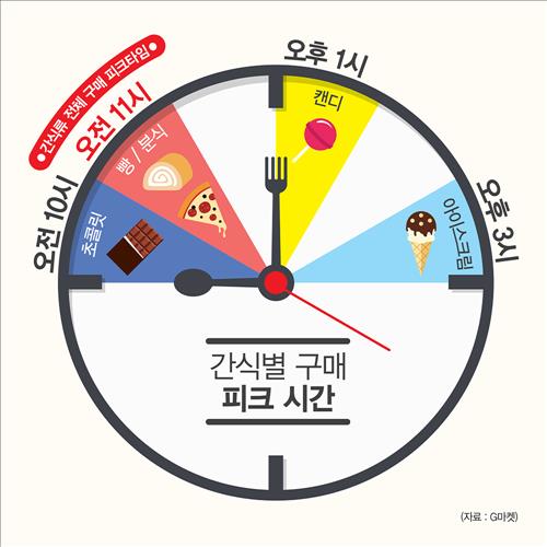 1일 온라인쇼핑사이트 G마켓(www.gmarket.co.kr)에 따르면 올해 들어 지난달 28일까지 분식·빵·아이스크림·초콜릿·캔디 등 5개 대표 간식류의 시간대별 판매량을 조사한 결과, 오전 11시가 1위로 집계됐다. 이 시간대에 하루 간식 판매량의 7.2%가 집중됐다.