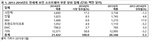 1일 시장조사기관 가트너에 따르면 지난해 전 세계 보안 소프트웨어 매출은 2013년 203억달러보다 5.3% 증가한 214억달러(약 23조원)를 기록했다.