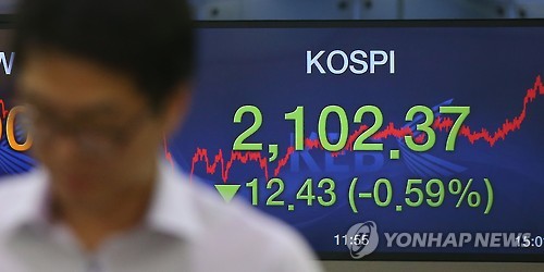 이날 코스피는 전 거래일보다 12.43포인트(0.59%) 내린 2,102.37로 마감했다.