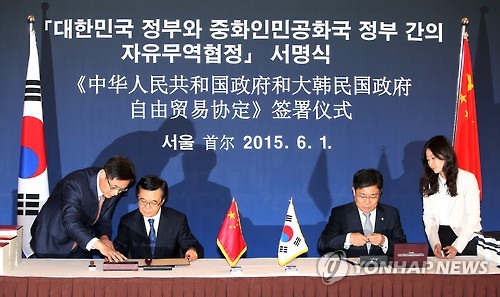 | △ 한-중 자유무역협정 서명식 (서울=연합뉴스) 한종찬 기자 = 1일 오후 서울 용산구 소월로 그랜드하얏트 호텔에서 '한-중 자유무역협정(FTA) 서명식'이 열리고 있다. 앞줄 오른쪽 두번째부터 윤상직 산업통상자원부 장관, 가오후청 중국 상무부장. |