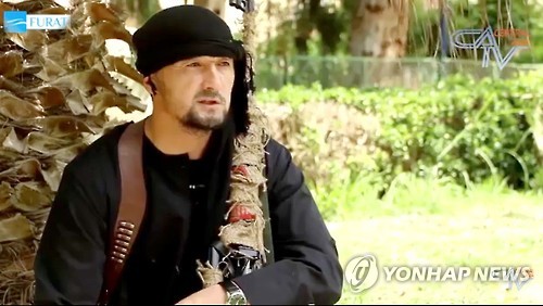 | △ 타지키스탄 특수경찰대장 IS 가담 (알마티=연합뉴스) 김현태 특파원 = 중앙아시아 타지키스탄의 특수경찰대장 굴무로드 하리모프가 수니파 무장조직 이슬람 국가(IS)에 가담해 충격을 주고 있다. 특히 그는 미국 및 중앙아시아 각국의 대테러 전술을 섭렵한 터라 국제사회의 우려가 커지고 있다. 사진은 최근 그가 IS 복장으로 미국에 맞서 싸우겠다고 말하는 모습. 2015.6.1 << 센트럴 아시아 TV 캡처 >> mtkht@yna.co.kr |