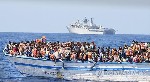 | △ (리비아 EPA=연합뉴스) 지난달 28일(현지시간) 리비아 북부 해안에서 369명의 유럽행 난민들이 작은 목선을 빽빽이 채운 채 위험한 항해를 하고 있다. 이들은 이날 영국 해군에 의해 구조됐다. |