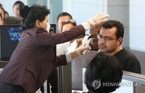 | △ '철저한 검역' (서울=연합뉴스) 김주성 기자 = 메르스(중동호흡기증후군) 감염 환자가 18명으로 늘어난 1일 오후 중동발 여객기를 타고 인천공항에 도착한 한 외국인이 발열 감시 적외선 카메라에 열이 감지되자 정밀 체온측정을 받고 있다. 2015.6.1 utzza@yna.co.kr |
