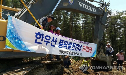 | △ 한우산 풍력발전단지 중단하라 (의령=연합뉴스) 경남 의령군 궁류면 주민 등으로 구성된 한우산풍력발전반대대책위원회가 지난달 27일 풍력발전단지 공사 현장에서 기자회견을 열어 공사중단을 요구하고 있다. 2015.6.2 <<마산창원진해환경운동연합>> seaman@yna.co.kr |