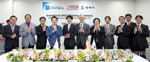 | △ 일본 발카공업, 평택에 추가 투자협약식 (수원=연합뉴스) 2일 오후 발카코리아 평택공장에서 열린 '발카공업(주) 추가투자 협약식'에 참석한 남경필 경기도지사와 타키사와 발카코리아 사장 등 관계자들이 협약서에 서명하고 나서 기념촬영을 하고 있다.2015.6.2 <<경기도 제공>> hedgehog@yna.co.kr |