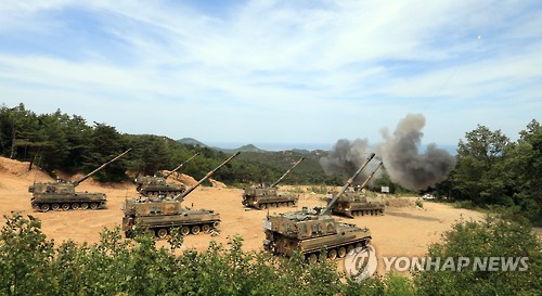 | △ K-9자주포의 위용 (고성=연합뉴스) 이종건 기자 = 육군 8군단이 지난 1일 동해안에서 시행한 지·해·공 합동해상사격 훈련에서 K-9자주포가 해상의 표적인 적 함정을 향해 포격을 가하고 있다. 호국보훈의 달을 맞아 6·25전쟁을 상기하고 적 도발 시 강력하게 응징하겠다는 결의를 다지고자 진행된 이날 훈련은 적의 해상침투 상황을 가정, 감시망에 포착된 적 함정을 육군과 공군, 해군이 해상에서 격멸시키는 작전이 실전과 같이 전개됐다. 2015.6.2 momo@yna.co.kr |