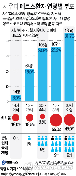 15∼29세(64명)는 15%, 30∼44세(106명)는 24.9%, 45∼59세(107명)는 25.2%, 60세 이상 환자(135명)는 전체의 31.7%를 차지해 나이가 많을수록 메르스에 걸리는 경우가 더 많은 것으로 나타났다.