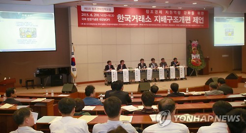 | △ 한국거래소 지배구조 개편 제언 (서울=연합뉴스) 이상학 기자 = 2일 국회 헌정기념관에서 열린 제6차 창조경제정책포럼에서 주요 인사들이 '한국거래소 지배구조 개편 제언'에 대한 주제 토론을 하고 있다. |