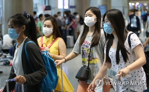 | △ 마스크 착용한 외국인 관광객들 (영종도=연합뉴스) 임헌정 기자 = 중동호흡기증후군(메르스) 여파로 유커(遊客·중국인 관광객) 300여명이 한국 여행을 취소한 것으로 나타났다. 지난해 610만명이 방한, 우리나라의 관광·유통산업을 떠받쳤던 '유커 특수'가 메르스 확산으로 타격을 받을 수 있다는 우려가 현실화하고 있다. 사진은 마스크를 착용하고 2일 오후 인천국제공항에 입국하는 외국인 관광객들. 2015.6.2 kane@yna.co.kr |