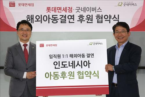 롯데면세점과 굿네이버스는 전날 롯데면세점 본사에서 이를 위한 '해외아동 1대 1 결연' 협약식을 가졌다.