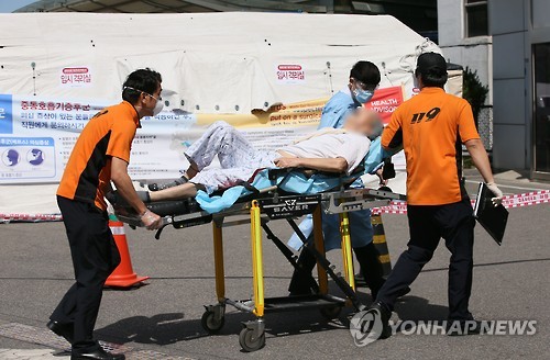 | △ 응급환자 이송하는 119구급대원들 (서울=연합뉴스) 박지호 기자 = 119구급대원들이 3일 오전 메르스 의심환자 격리센터가 운영되고 있는 연건동 서울대학교병원 응급실로 응급환자를 이송하고 있다. 2015.6.3 jihopark@yna.co.kr |