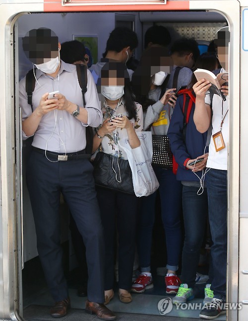 | △ 메르스 확산, 마스크 쓴 시민들 (서울=연합뉴스) 김도훈 기자 = 중동호흡기증후군(메르스) 확진 환자가 30명으로 늘어난 3일 오전 서울 영등포구 신도림역에서 시민들이 마스크를 쓰고 출근하고 있다. |