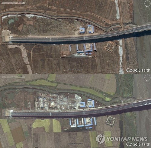 지난해 10월과 올해 3월의 위성사진을 비교해보면 신압록강대교의 북측 도로 공사는 전혀 진전이 없을 뿐 아니라 올해 들어서는 공사 진행 조짐도 없어졌다.
