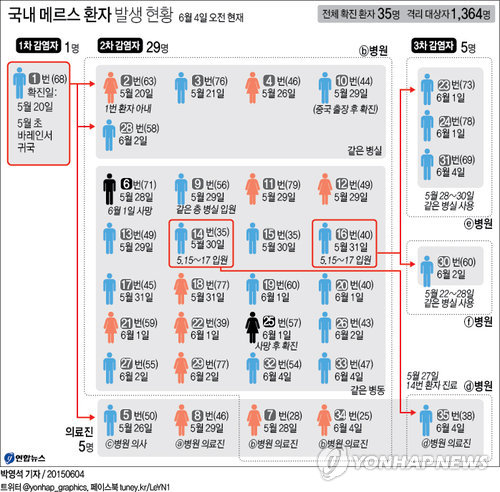 | △ <그래픽> 국내 메르스 환자 발생 현황(4일) (서울=연합뉴스) 박영석 기자 = 중동호흡기증후군(메르스) 환자가 5명 늘어 전체 환자수가 35명이 됐다. 이 중에는 의사가 2명이고 3차 감염자도 2명이 포함돼 지금까지 의사 및 3차 감염자는 각각 5명으로 집계됐다. 아직 지역사회 전파 사례는 없고 모두 병원 내 감염으로 보건당국은 분석하고 있다. zeroground@yna.co.kr |