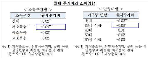 이를 회귀분석해 보니 월세주거비가 1% 상승하면 전체 가계의 소비감소 효과는 0.02%인 것으로 집계됐다.
