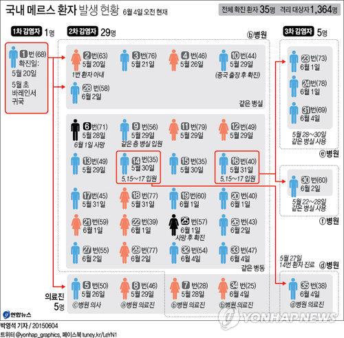 첫 환자 A씨와 3차 감염 환자 5명을 뺀 29명의 환자 중 6명만 A씨 확진 이후 당국의 통제하에 있었고 나머지 23명은 병원 혹은 각자의 가정 등에서 메르스 의심환자로서 관리를 받지 못했었다.