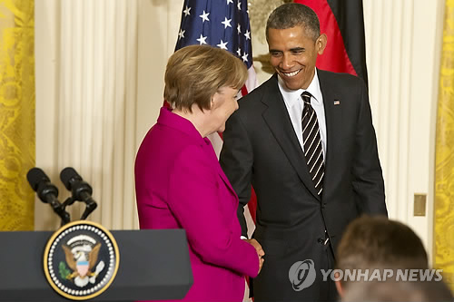 | △ 손 맞잡은 오바마와 메르켈 (AP=연합뉴스) 버락 오바마 미국 대통령과 앙겔라 메르켈 독일 총리가 9일(현지시간) 백악관에서 정상회담을 가진 후 우크라이나 분리주의 반군을 지원하는 러시아를 강도높게 비판하고 즉각적인 도발 중단을 촉구했다. 사진은 오바마 대통령(오른쪽)과 메르켈 총리가 정상회담 관련 공동기자회견을 마치고 악수를 나누는 모습. |