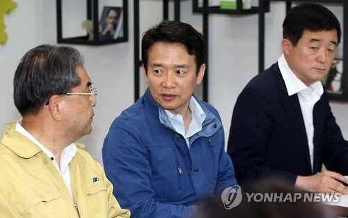 | △ 4일 오후 경기도 수원 경기도청에서 열린 중동호흡기증후군(메르스) 사태에 대응하기 위한 경기도 대책회의에 참석한 남경필 경기도지사(가운데). 왼쪽은 이재정 경기도교육감, 오른쪽은 강득구 경기도의회 의장. |