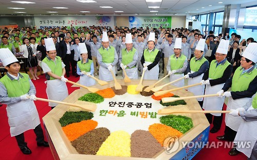 | △ (부산=연합뉴스) 차근호 기자 = 5일 오전 부산시 영도구 한진중공업 영도조선소에서 열린 '한마음 비빔밥' 행사에서 안진규 한진중공업 사장을 비롯한 노사 간부들과 김무성 새누리당 대표, 지역주민 등 내빈들이 화합을 다짐하는 비빔밥 만들기를 하고 있다. 이번 행사는 다양한 재료가 섞여 음식이 되는 비빔밥처럼 노사가 화합을 통해 지역경제의 견인차가 되자는 의미를 담고 있다. 2015.6.5 ready@yna.co.kr |
