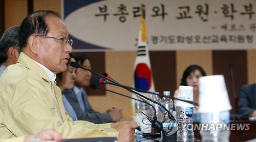 (오산=연합뉴스) 이영주 기자 = 황우여 사회부총리 겸 교육부 장관이 5일 마련한 중동호흡기증후군(메르스) 관련 학교장·학부모 간담회에서 "휴교령을 내려달라"는 요청이 이어졌다.