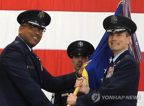 | △ 폴 W 티베츠 4세 미국 공군 준장(오른쪽)이 5일(현지시간) 미국 미주리 주 화이트맨 공군 기지에 있는 제509 폭격비행단의 단장으로 취임했다. 509 폭격비행단은 미군의 전략 핵폭격기인 B-2 스피리트 기지에 있다. 티베츠 4세 단장은 1945년 B-29기를 몰고 일본 히로시마에 원자폭탄을 투하한 조종사 티베츠 주니어의 손자다.(AP=연합뉴스) |
