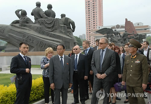| △ 북한주재 러시아대사 전쟁승리기념관 참관 (평양 조선중앙통신=연합뉴스) 러시아의 제2차 세계대전 승전 70주년을 맞아 알렉산드르 마체고라 북한 주재 러시아 대사가 대사관 관계자들과 14일 조국해방 전쟁승리기념관을 참관했다며 조선중앙통신이 이사진을 보도했다. 2015.5.15 photo@yna.co.kr |